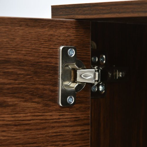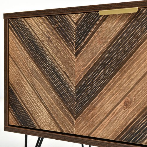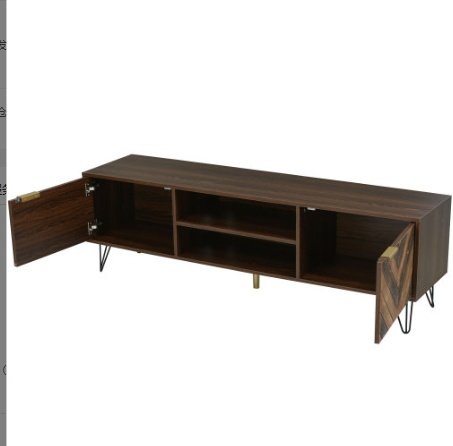 - Das Lowboard verfügt über zwei Türen, Hinter denen sich jeweils ein geräumiges Fach befindet. Diese bieten Ihnen ausreichend Platz, um Ihre DVDs, Spielekonsolen, Fernbedienungen und andere Utensilien ordentlich zu verstauen. Die Türen sind mit goldenen Griffen versehen und mit natürlichen Holzmaserungen verziert, was dem TV-Lowboard einen Hauch von Eleganz verleiht.